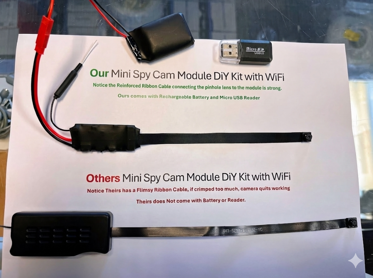 Mini Hidden Camera DIY Small Wireless Spy Camera Tiny WiFi Security Cam Covert Nanny Camera. Only our model has a Reinforced super strong ribbon cable connecting the pinhole lens to the board. The super thin design of our module with heat shrink tubing has better audio reception than plastic designed models.